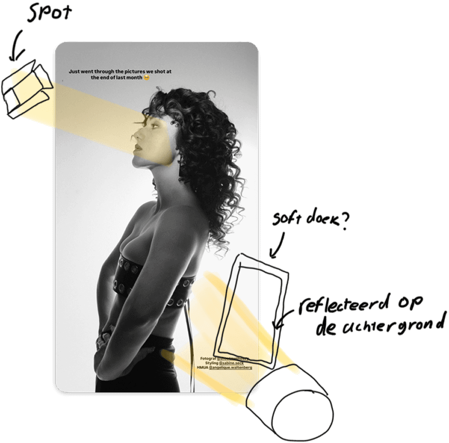 Om tijd in de studio te besparen en een houvast te hebben heb ik goed gekeken naar de inspiratie foto's en gekeken hoe hun de lichten hadden opgesteld.